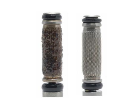 具有漆膜/油泥的伺服閥過濾器與新過濾器的對比。