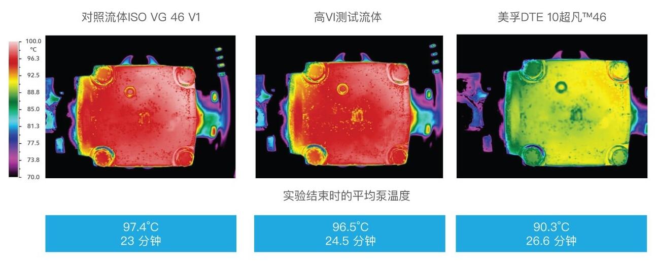 我們在沒有熱交換器的簡單液壓回路中測試了三種潤滑油,并利用熱能成像展示了美孚 DTE 10 超凡™ 46 如何在泵系統(tǒng)中減少摩擦損失。